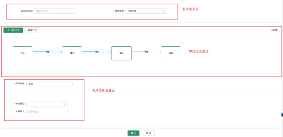 2. 審批流設(shè)置區(qū):主要用于審批流的設(shè)計(jì),添加、刪除審批節(jié)點(diǎn),控制審批節(jié)點(diǎn)的順序